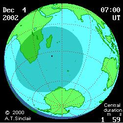Totale Sonnenfinsternis über dem Indischen Ozean und der Antarktis. Auf der Nordhalbkugel nicht beobachtbar.